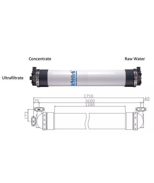 Parametri dell'attrezzatura: UFP250 Modulo a membrana UF a fibra cava in PVC da 10", 32 pezzi/gruppo, 2 gruppi, 64 pezzi in totale, flusso operativo di progettazione 50 l/m².h