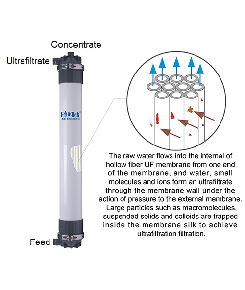 ● Il grado di filtrazione della membrana PVDF UF è di 0,1 micron, le particelle vengono intrappolate dalla parete della membrana